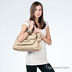 Женская сумка выполнена из бежевого кожезаменителя, на ножках, закрывается на магнитную кнопку.