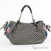 Оригинальная женская сумка из текстиля. Стенки изделия мягкие. Сумка декорирована бантами. Два внешних открытых кармана. Основное отделение застегивается на магнитную кнопку. Внутри один кармашек на липучке, один открытый и один прорезной карман на молнии. Подкладка - текстиль. Ручки средней длины позволяют носить сумку на плече. Цвет фурнитуры - серебряный. Дно формованное с металлическими ножками.