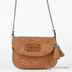 Передняя часть сумки декорирована металлической вставкой. Основное отделение застегивается на магнитную кнопку. Внутри один прорезной карман на молнии. Наплечная цепочка отстегивается от изделия. Изделие украшено "кисточками".