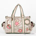 Женская сумка выполнена из комбинации искуственного шелка и кожезаменителя, на ножках, закрывается на молнию.