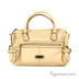 Дамская сумка прямоугольной формы. Основное отделение закрывается на молнию, содержит разного типа карманы. С лицевой и задней стороны карман на молнии. Бока декорированы пряжками с накладными карманами на кнопке. Подкладка - коричневый нейлон, фурнитура - светлое золото. Ручки жесткие, средней длинны. В наличии съемный, регулируемый плечевой ремень. Дно мягкое.