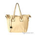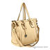 Дамская сумка. Одно отделение на молнии. Внутри сумки отделение на молнии, разделяющее ее на две части. Подкладка - коричневый нейлон, фурнитура - светлое золото. Основной декоративный элемент - вставки из более жесткой кожи с лицевой и задней стороны сумки. Также с задней стороны карман на молнии. Мягкие короткие ручки, съемный регулируемый плечевой ремень. Дно на ножках.