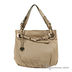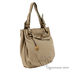 Дамская сумка. Одно отделение на молнии. Внутри карманы разного типа. В верхней части сумки декоративный ремешок. С задней стороны карман на молнии. Подкладка - коричневый нейлон, фурнитура - светлое золото. Ручки средней длинны. Дно мягкое в сборку.