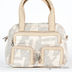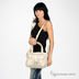 Изящная и стильная сумка. Плотные стенки. Передняя часть сумки дополнена двумя маленькими кармашками на молнии и одним средним карманом. Нижняя часть сумки сделана из кожи. Основное отделение застегивается на молнию. Внутри одно большое отделение, один небольшой карман на молнии и два открытых кармашка для кошелька и мобильного. Ручки выполнены из мягкой кожи. Есть длинный съемный регулируемый ремешок. Ножек нет. Цвет фурнитуры - серебро. Формованное дно.