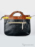 Изящная сумка из фактурной искусственной кожи. Плотные стенки изделия. Один внешний прорезной карман. Сумка декорирована контрастными вставками и горизонтальной полосой, проходящей через шлевки и дополненной висячим замочком. Основное отделение застегивается на молнию. Короткие ручки позволяют носить сумку в руке.