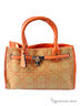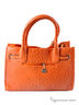 Яркая женская сумка из плотного материала. Ручки средней длины. Спереди сумка декорирована горизонтальными полосами кожи, соединенными с помощью декоративного замочка. На обратной стороне внешний прорезной карман на молнии.