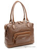Женская сумка из натуральной кожи коричневого цвета. Внутри два отдела, разделены средником на молнии, с одной стороны скрытый карман на молнии, с другой два открытых кармана для сотового телефона и мелочи. Размеры: длина 33 см, высота 25 см, ширина 14 см, длина ручек 22 см.