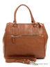 Женская сумка из натуральной кожи коричневого цвета. Три отдела на молнии, в среднем два отдела, разделены средником на молнии, с одной стороны скрытый карман на молнии, с другой два открытых кармана для сотового телефона и мелочи. Размеры: длина 30 см, высота 25 см, ширина 14 см, длина ручек 14 см.