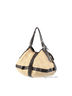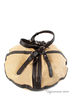 Необычной формы дамская сумка-мешок с одним отделением на кнопке. Выполненна из рогожки с элементами из экокожи коричневого цвета. Внутри сумки карманы разного типа, косметичка. По бокам молнии, с помощью которых можно увеличить сумку в объеме. Подкладка - бежевый нейлон, фурнитура - золото. Две короткие ручки-ремешки. Дно мягкое. 21(39)-40-40см