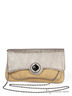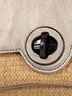 Небольшой клатч из двух материалов - основная часть из мягкой соломки, а клапан выполнен из блестящей экокожи. Подкладка - бежевый хлопок, фурнитура - никель. Небольшой и аккуратный замочек. Длинный съемный плечевой ремень - цепочка. 14(70)-27-1см