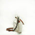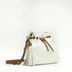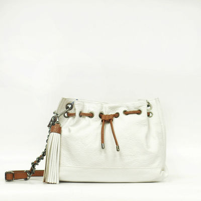 Маленькая сумочка-мешочек с декоративным затяжным ремешком с лицевой стороны, кистью из экокожи сбоку. Основной отдел закрывается на кнопку и содержит разного типа карманы. Подкладка - бежевый хлопок, фурнитура - никель. Длинный регулируемый плечевой ремень из контрастной коричневой экокожи.