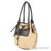 Изящная женская сумка из рогожки с элементами экокожи. Стенки изделия средней плотности. Основной отдел закрывается на застежку и содержит разного типа карманы. С внешней стороны расположены два втачных кармана. Ручки средней длины позволяют носить сумку на плече.