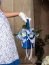 Сумка-корзинка синего цвета. Изделие украшено белыми цветочными аппликациями со стразами. Тонкие атласные ленты дополнены декоративным элементом в форме цветка.