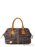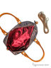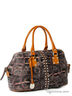 Сумка женская, натуральная кожа, овальной формы, на молнии. Внутри сумки есть два кармана, один на молнии. Сумка изготовлена с эффектом состаренной кожи и декорирована металлическими клепками. Ручки изготовлены из контрастной кожи коричневого цвета с брелоком с логотипом марки. Дно на металлических ножках. К сумке прилагается съемный регулируемый ремень-ручка. Размер: 45*25*18.