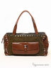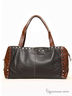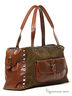 Трехцветная сумка прямоугольной формы, две ручки. По бокам глянцевая кожа рыжего цвета с отделкой клепками, 2 ручки, на лицевой стороне большой накладной карман из гладкой кожи с магнитной застежкой.