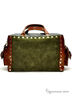 Трехцветная сумка прямоугольной формы, две ручки, съемный ремень. По бокам 2 кармана глянцевая кожа рыжего цвета с отделкой клепками, 2 ручки.