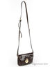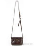 Изысканная сумочка коричневого цвета, с закругленными нижними углами, на клапане - декоративная застежка желтого металла, одна длинная ручка. Имитация кожи крокодила.