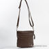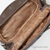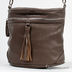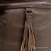 Внешняя сторона декорирована небольшой кисточкой. Основное отделение застегивается на металлическую молнию. Внутри один карман на молнии для документов, один маленький карман для визиток или кредиток. Плотная ручка. Длинный съемные ремень. Ножек нет.