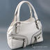 Трендовая женская сумка из экокожи. Основное отделение застегивается на молнию. Внутри два открытых кармашка и один прорезной на молнии. Один внешний карман на задней стенке на молнии. Два прорезных кармашка на молнии с лицевой стороны. Подкладка - текстиль, стенки изделия средней плотности. Лицевая сторона изделия декорирована металлической вставкой с логотипом бренда. Ручки средней длинны позволяют носить сумку на плече. Цвет фурнитуры - серебряный, дно формованное.