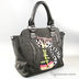 Нетрадиционная женская сумка из экокожи. Одно основное отделение. Два открытых кармашка и один прорезной на молнии. Один внешний карман на задней стенке на молнии. Подкладка - текстиль, стенки изделия плотные. Небольшие ручки и съемный ремешок в комплекте, позволяющий носить сумку на плече. Лицевая сторона изделия декорирована оригинальной нашивкой. Дно формованное, цвет фурнитуры - серебряный.