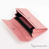 Очаровательный женский кошелек, нежно-розового цвета выполненный из 100% кожи. Застежка на кнопку. Внутри: четыре отделения для визиток или кредитных карт, пять отделений для купюр, одно с застежкой на молнию, с внешней стороны карман для мелочи с застежкой на кнопку. К изделию пришита ручка регулируемая по длине.