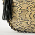 Трендовая сумка из натуральной кожи с выделкой под кожу питона. Сумка имеет мягкие стенки. Передняя сторона сумки декорирована вставкой в виде логотипа бренда. Основное отделение застегивается на молнию. Поводок выполнен в виде длинной кисточки из кожи. Внутри одно большое отделение, один небольшой карман на молнии и два открытых кармашка для кошелька и мобильного. Длинный практичный ремешок из лакированной мятой кожи. Ножек нет. Цвет фурнитуры - серебро.