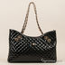 Изящная женская сумка из лаковой кожи с прострочкой. Стенки изделия мягкие. Передняя часть сумки декорирована логотипом бренда. Основное отделение застегивается на молнию. Внутри два открытых кармашка и один прорезной карман на молнии. Подкладка текстиль. Ручки средней длины позволяют носить сумку на плече. Цвет фурнитуры - золото, ножки отсутствуют. Дно плотное, формованное.
