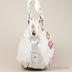 Изящная женская сумка из искусственной кожи. Стенки изделия плотные. Передняя часть сумки декорирована цветами. Один внешний карман на молнии. Основное отделение застегивается на молнию. Внутри три открытых кармашка и два кармана на молнии. Подкладка - Текстиль. Ручки средней длины позволяют носить сумку на плече. Цвет фурнитуры - серебро, ножки отсутствуют. Дно формованное.
