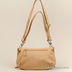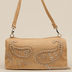 Изящная женская сумка из искусственной фактурной кожи. Стенки изделия мягкие. Передняя часть сумки декорирована блестящими вставками и деревянными элементами. Один внешний карман на молнии. Основное отделение застегивается на металлическую молнию и молнию. Внутри два открытых кармашка и один прорезной карман на молнии. Подкладка - текстиль. Съемная ручка средней длины позволяют носить сумку на плече, в комплекте съемный ремешок. Цвет фурнитуры - серебро, ножки отсутствуют.