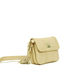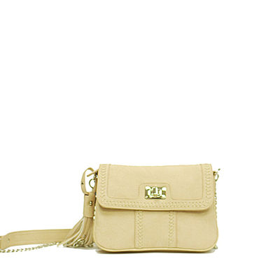 Маленькая сумочка с небольшой декоративной кистью сбоку и плетением по канту клапана, на замочке и центральной части. Основной отдел закрывается на молнию и содержит разного типа карманы. Подкладка - бежевый хлопок, фурнитура - серебро. Длинный плечевой ремень со вставками из металла.