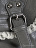 Маленькая сумка из экокожи и искусственного меха. Основное отделение с карманами разного типа под клапаном на кнопке, разделено на две части отделением с молнией. С задней стороны карман на молнии. Подкладка - черный нейлон, фурнитура - черный антик. Регулируемый плечевой ремень. Размеры: 19(48)-28-6см