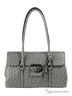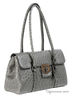 Строгая сумка из экокожи под страуса. Основное отделение под клапаном на замке, разделено на две части отделением с молнией, содержит карманы разного типа. Подкладка - серый нейлон, фурнитура - черный антик. Ручки средней длинны, твердые. Размеры: 20(43)-34-12см