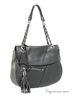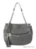 Небольшая дамская сумка из натуральной кожи серого цвета. Основное отделение под клапаном на магнитах, содержит карманы разного типа. С лицевой и задней стороны карман на молнии, так же с лицевой стороны небольшая декоративная кисть. Подкладка - серый хлопок, фурнитура - серебро. Средней длинны на цепочке ручка. Размеры: 23(45)-32-7см