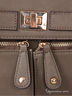 Строгая сумка - портфельчик из экокожи серого цвета. Основное отделение под клапаном на замке, закрывается на молнию. Внутри карманы разного типа. С лицевой стороны два кармана на молниях, с обратной стороны карман на молнии. Подкладка - оранжевый нейлон, фурнитура - золото. Короткая жесткая ручка. Съемный, длинный, регулируемый плечевой ремень. Дно мягкое. Размеры: 22(33)-31-12см