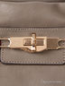 Небольшая дамская сумка из экокожи серого цвета. Основное отделение закрывается на молнию. Внутри отделение на молнии, разделяющее ее на две части, так же карманы разного типа. С лицевой стороны карман под клапаном на замке и молнии. С обратной стороны карман на молнии. Подкладка - оранжевый нейлон, фурнитура - золото. Две жесткие ручки средней длины. Съемный, длинный, регулируемый плечевой ремень. Дно мягкое. Размеры: 21(42)-34-13см