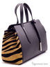 Стильная сумка из натуральной кожи на молнии с двумя ручками средней длины, высотой 14 см. По бокам вставки из меха пони с принтом под зебру. Внутри одно открытое отделение, два боковых кармана на молнии, один открытый карман. Украшена съемной изящной подвеской с логотипом.33 (Д) х 13 (Ш) х 23 (В)
