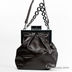Основное отделение застегивается на оригинальный рамочный замок. Внутри один карман на молнии для документов + два маленьких кармана для визиток или кредитных карт. Ручка выполнена в виде цепи + короткий съемный ремешок. Ножек нет.