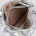 Женская сумка ELEGANZZA выполнена из натуральной кожи бело-серого цвета, с лазерным тиснением фиолетового цвета. Отделка - натуральная кожа бело-серого цвета. Сумка закрывается на общую пластиковую молнию. На задней стенке - открытый карман на магнитной кнопке. Внутри - два отделения, разделенные средником на молнии. В одном имеется кармашек на молнии, в другом - кармашек для мобильного телефона и открытый кармашек. Ножки на дне есть. Цвет фурнитуры - блестящее серебро. Модель не вмещает формат А4. Сумка держит форму в наполненном состоянии. Высота ручек (26 см) позволяет носить сумку на плече. В комплекте нет наплечного ремня.