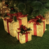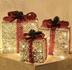 Новогодние светящиеся светодиодные коробки-подарки. Объёмная фигура подарков на металлическом каркасе с ажурной акриловой нитью - чудесное украшение для праздника. Фигурка покрыта блестками, украшена бантами, шишками, еловыми веточками и ягодами. Фигурка декорирована светодиодной гирляндой тёплого цвета с мерцающим эффектом. Фигура работает от электросети 220V. Размер: большая коробка: 25*25 см, средняя: 20*20 см, маленькая: 15*15 см