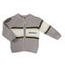 Свитер серый на молнии с трехцветной большой полосой по линии груди и на левом рукаве по центру. На правом рукаве нашивка.