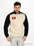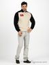 Теплый мужской свитер с воротником стойка и застежкой на молнию. Прямой силуэт. Ворот, манжеты рукавов и низ изделия оформлены в рубчик. Изделие украшено контрастными нашивками из шерсти и красной прострочкой.