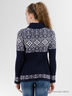 Женский приталенный свитер с высоким эластичным горлом. Модель прямого покроя с длинными рукавами, декорирована контрастной расцветкой. Примерная длина изделия по спинке 62 см.