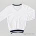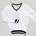 Модель прямого кроя с V-образным вырезом. Ворот, манжеты и низ изделия - трикотажные резинки.