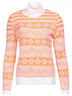 Свитер выполнен 2-цветной жаккардовой вязкой. Воротник гольф. Низ изделия и рукавов отвязан трикотажной резинкой.