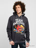 Отличный свитшот свободного силуэта из футера средней эластичности. Капюшон на кулиске с контрастной подкладкой. Манжеты длинного рукава и низ изделия в виде эластичной трикотажной резинки. На полочке оригинальный принт. Универсальный вариант как для повседневной носки, так и для занятий спортом.