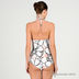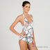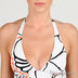 Топ с мягкой треугольной чашкой без косточек завязывается на шее. Украшен принтами.