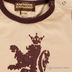 Толстовка прямого кроя. Имитация двух изделий в одном. Округлый вырез горловины окантован трикотажной резинкой. В плечевом шве застежка на две кнопки. Низ изделия и рукавов дополнен полоской коричневой ткани, имитирующей нижнюю футболку. Декоративная отстрочка контрастной нитью подола, рукавов. На полочке аппликация бархатистой фактуры. На левом рукаве декоративная нашивка с изображением льва.