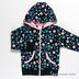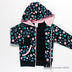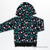 Толстовка прямого кроя с капюшоном застегивается на молнию на полочке по всей длине изделия. Манжеты и низ изделия - трикотажные резинки. Два передних кармана. Изделие украшено множеством мелких аппликаций.