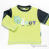 Футболка прямого кроя с длинным рукавом и эффектом двойки застегивается на две кнопки на левом плечике. Декоративные аппликации на полочке.