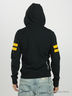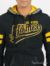 Стильная мужская толстовка свободного покроя. Капюшон с кулиской по краю. Застегивается на молнию. Длинные рукава реглан. Манжеты и низ изделия посажены на трикотажную резинку. На полочке и спине крупная нашивка. Два накладных кармана. Полочка декорирована объемной нашивкой.